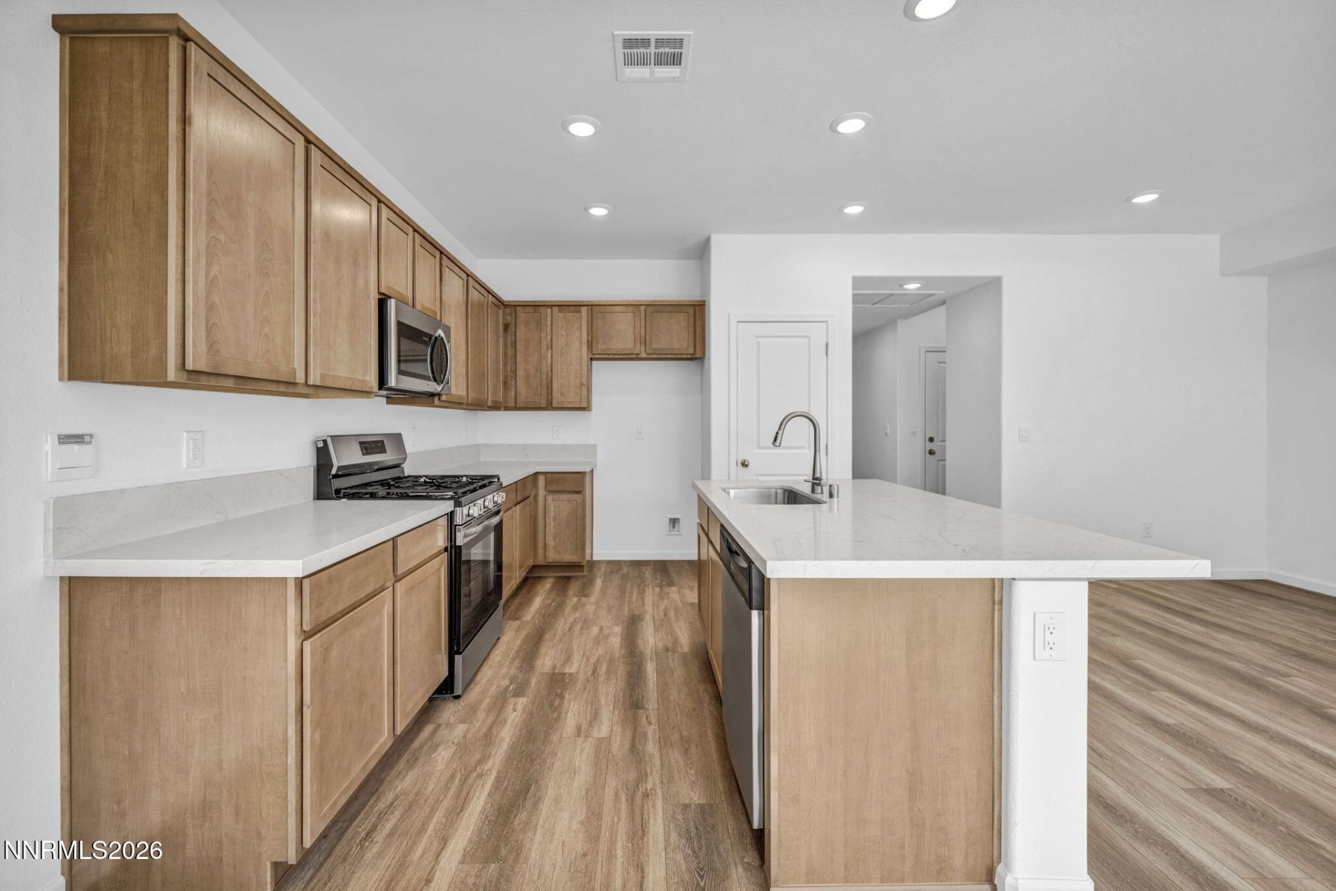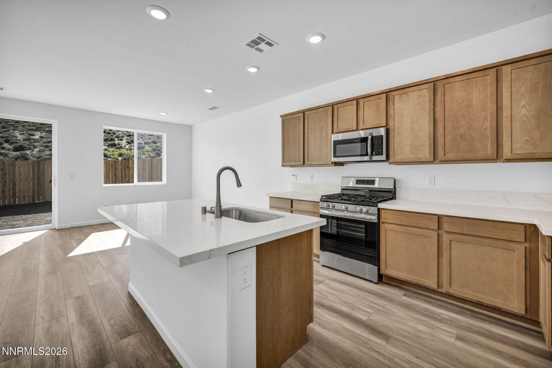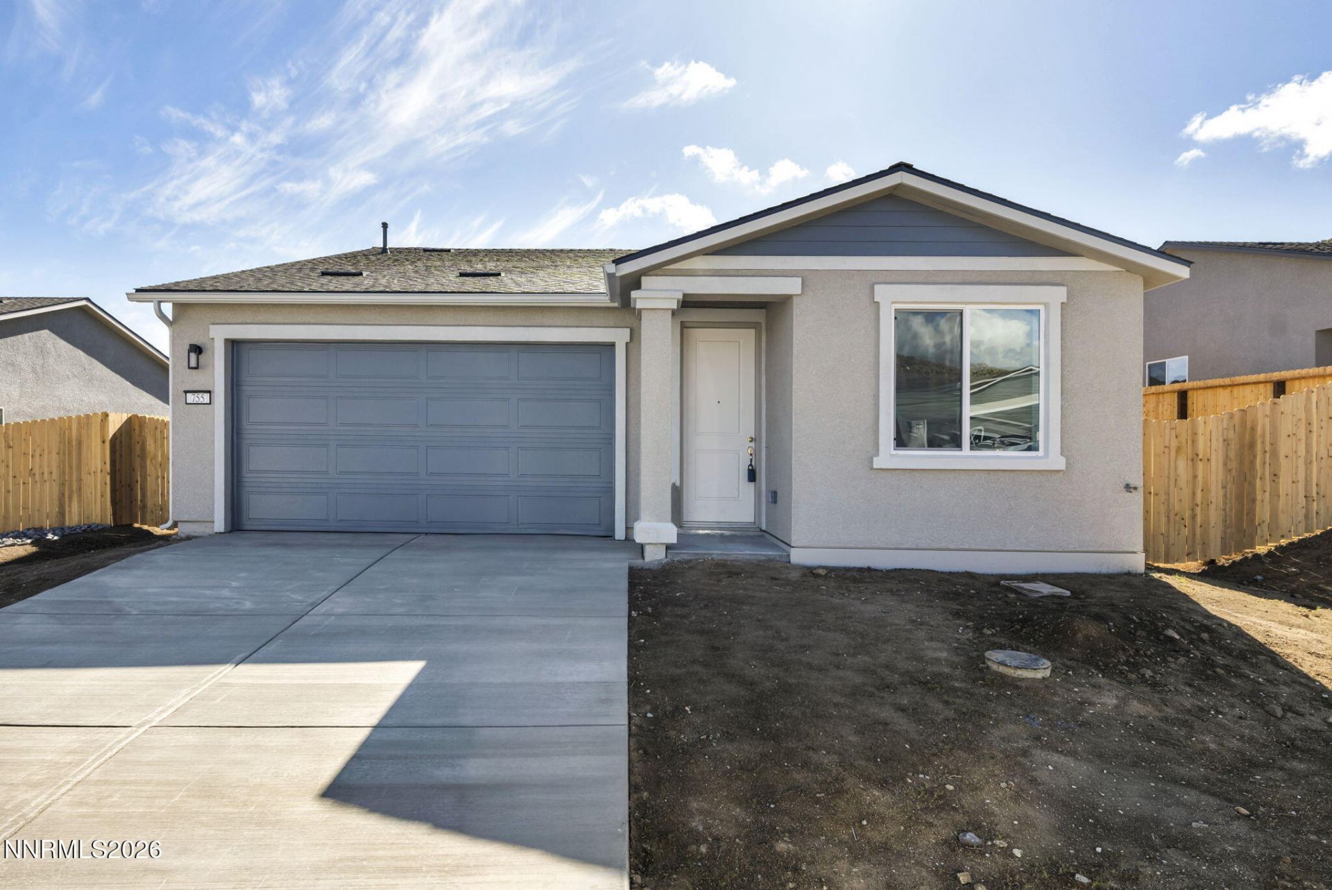 This single story home sits adjacent to rolling hills with a picturesque view of Nevada's natural landscape. Offering 3 bedrooms and 2 bathrooms, this nearly 1,500 sqft home is practical and functional. Gorgeous tile upgrades have been installed in both bathrooms and the master bathroom has a 5ft soaking tub for that perfect evening relaxation. Light brown cabinets and a quartz countertop upgrade in the kitchen allows a warm, welcoming tone. Hard surface, LVP flooring, is installed throughout the main living areas of the home. A great size yard finds the balance between plenty of private space and not-too-much to maintain, along with no rear neighbor. Located nearby adventurous off roading trails and neighborhood views of Swan Lake, this quiet neighborhood is the perfect place to settle in.